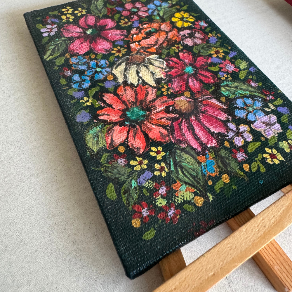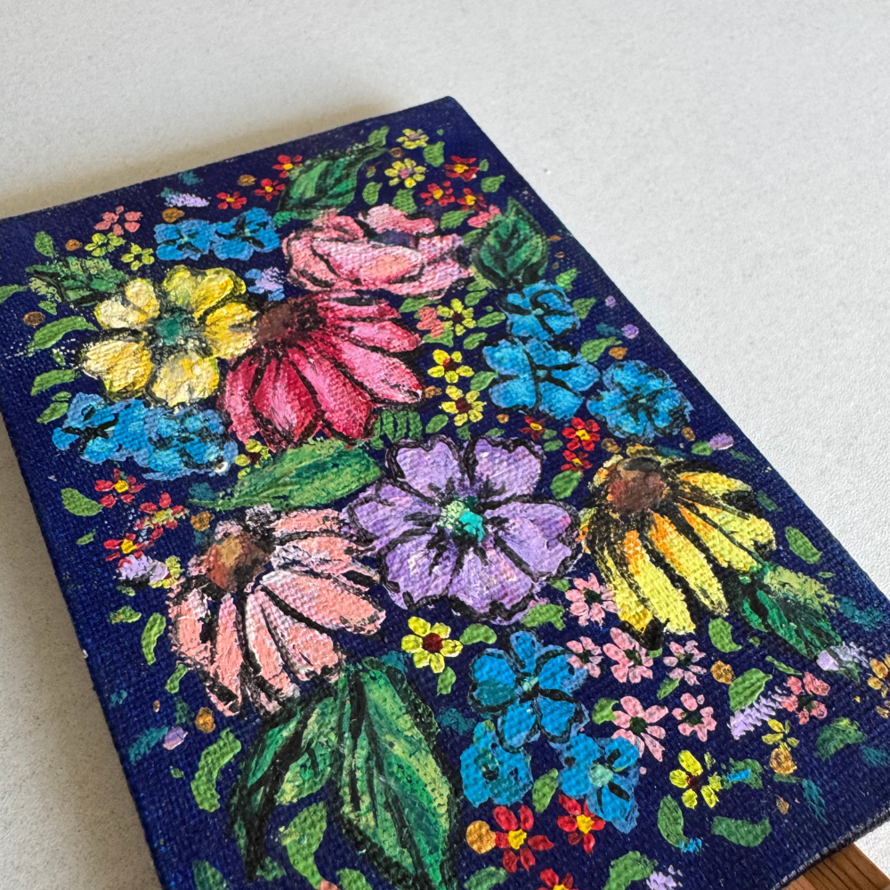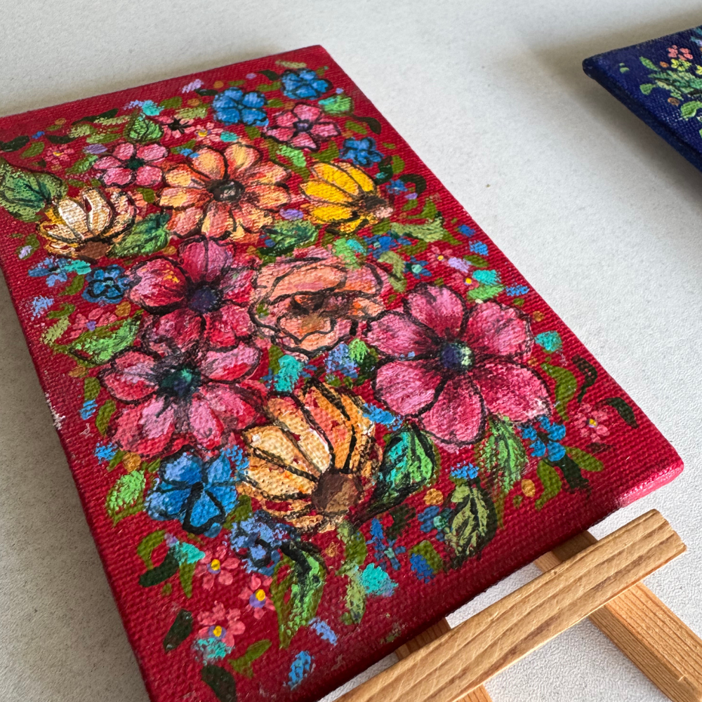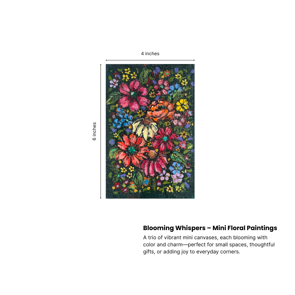 This trio of hand-painted mini canvases bursts with color, detail, and joy—each piece a celebration of nature’s abundance. Painted in vibrant hues, the florals come alive against richly toned backgrounds of deep green, crimson red, and midnight blue. Together, they create a harmonious set, yet each one holds its own unique personality.