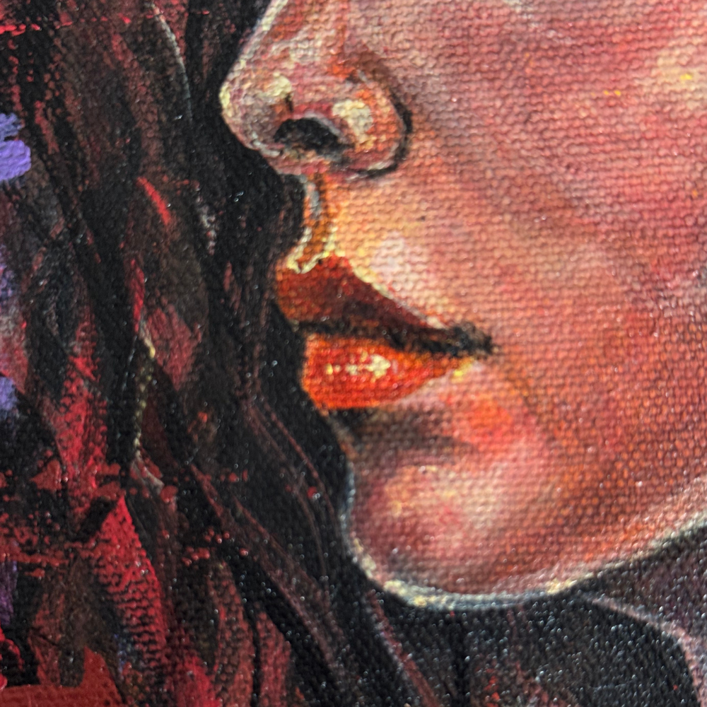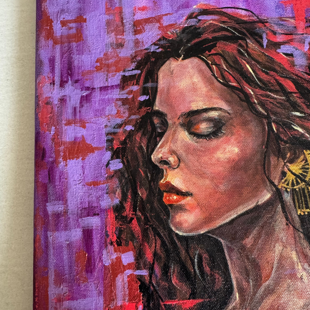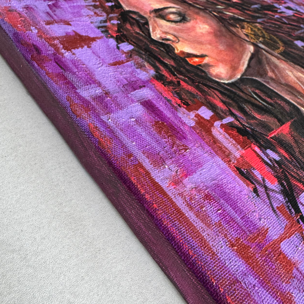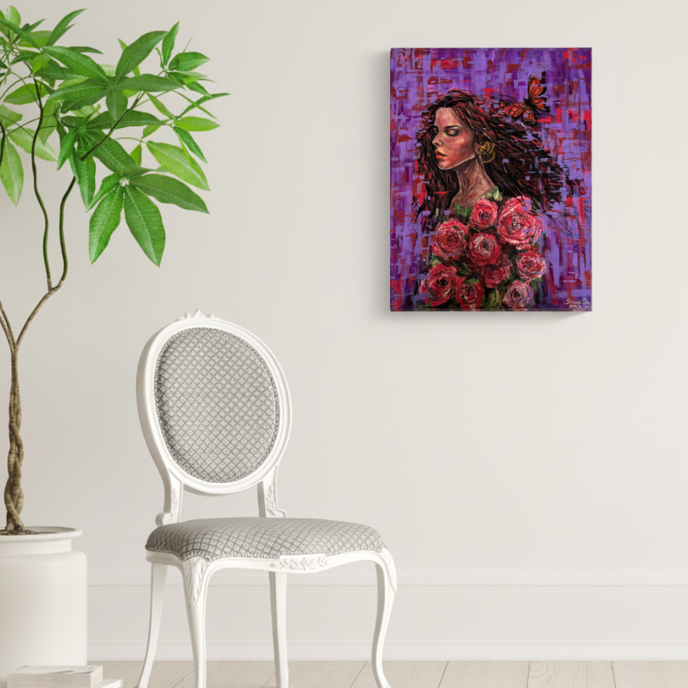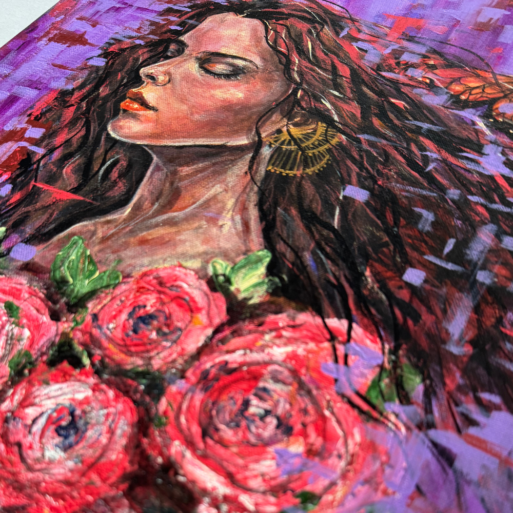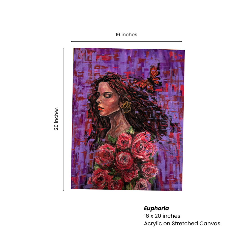 Euphoria captures a moment of serenity and transformation—a woman with closed eyes surrounded by blooming roses and touched by a butterfly in flight. Painted in rich purples, reds, and gold accents, this acrylic artwork radiates beauty, passion, and inner calm. Finished with a protective varnish, the stretched canvas comes unframed and ready to display.