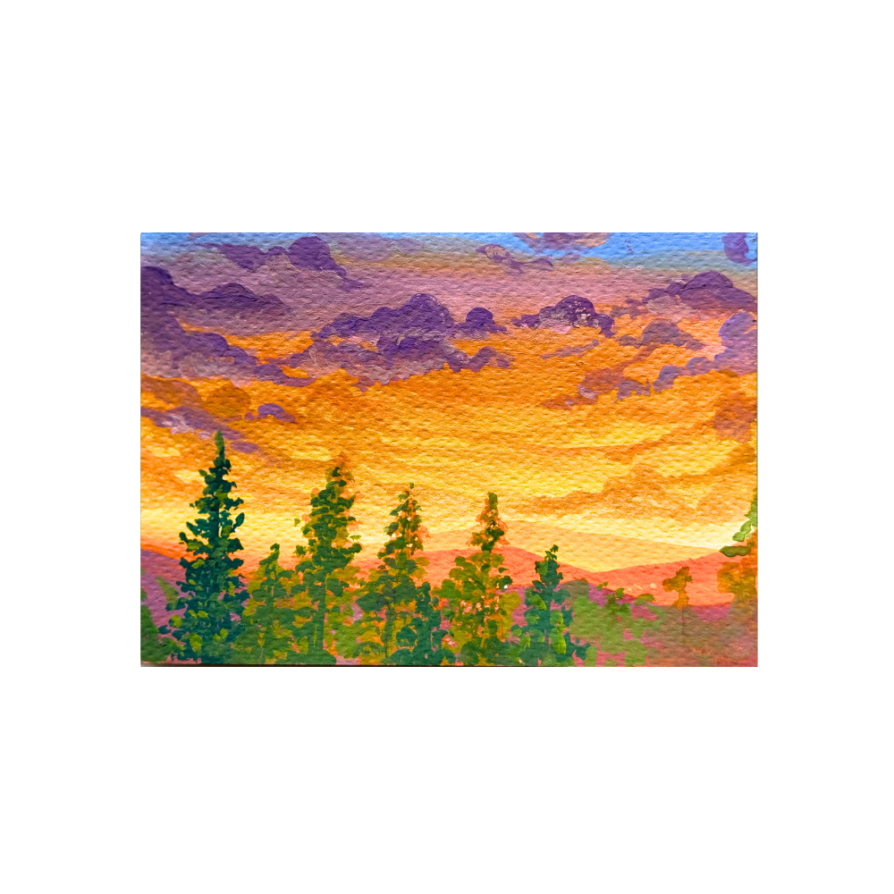 • Golden Dusk – a fiery sunset over pine trees, carrying the warmth and drama of day’s end.