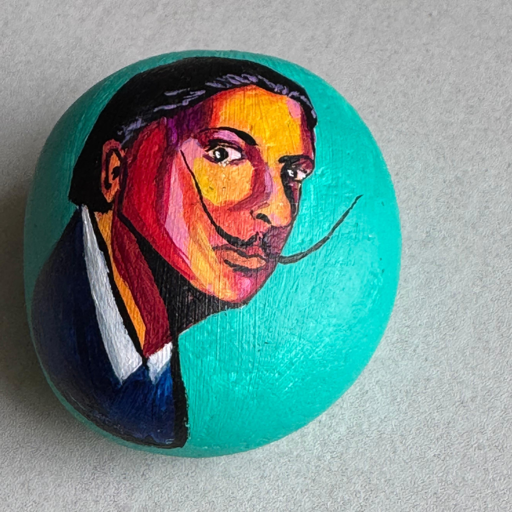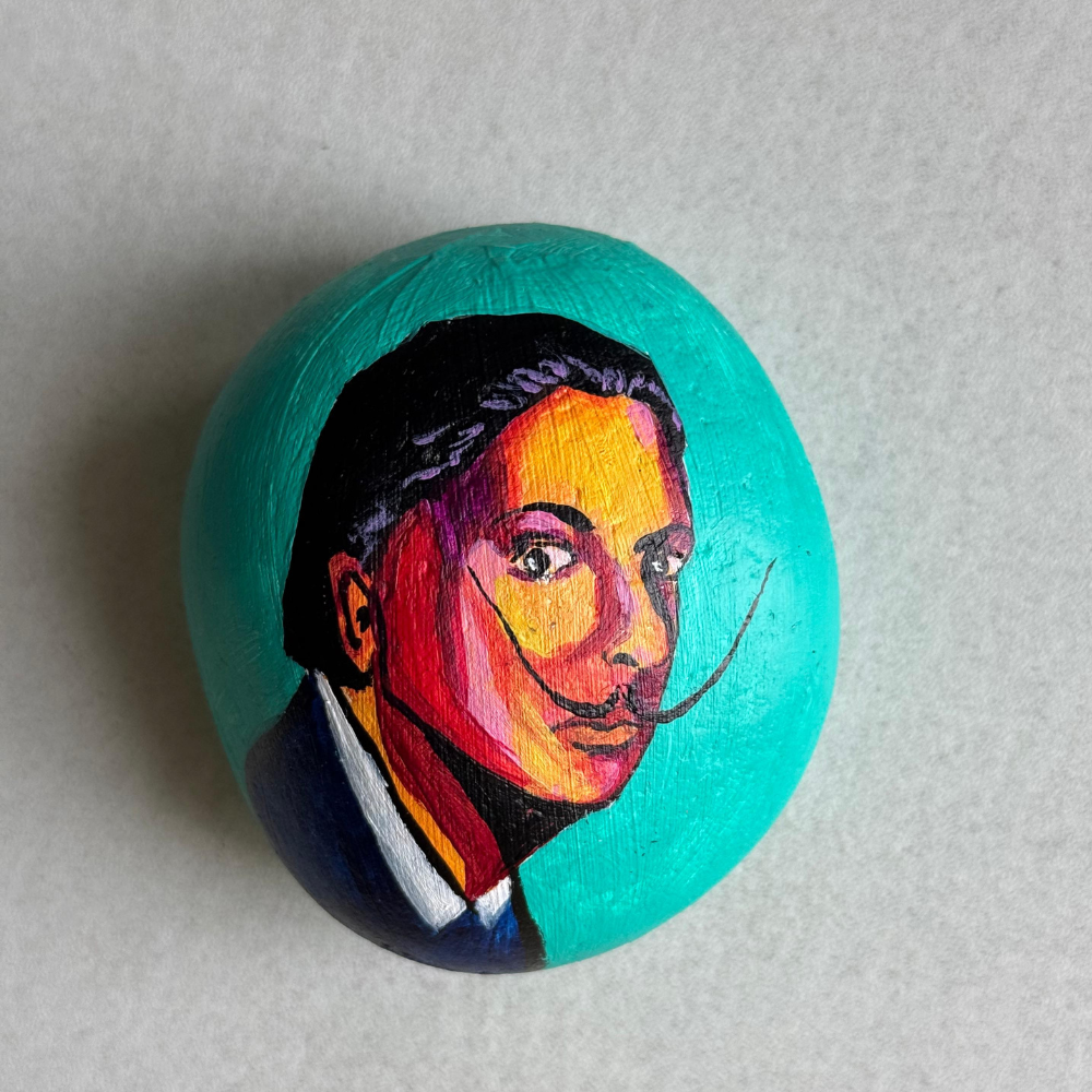 Whimsical, bold, and eccentric—this hand-painted stone pays tribute to the legendary surrealist, Salvador Dalí. With his unmistakable gaze and iconic curled mustache, the portrait is rendered in vivid tones of orange, pink, and purple against a turquoise backdrop. The striking color palette mirrors Dalí’s daring imagination and unconventional genius.