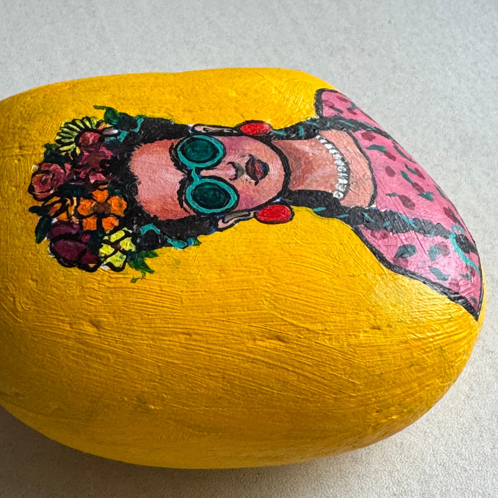 Bring a touch of artistic energy and bold color to your desk, shelf, or living space with this unique stone painting inspired by Frida Kahlo.