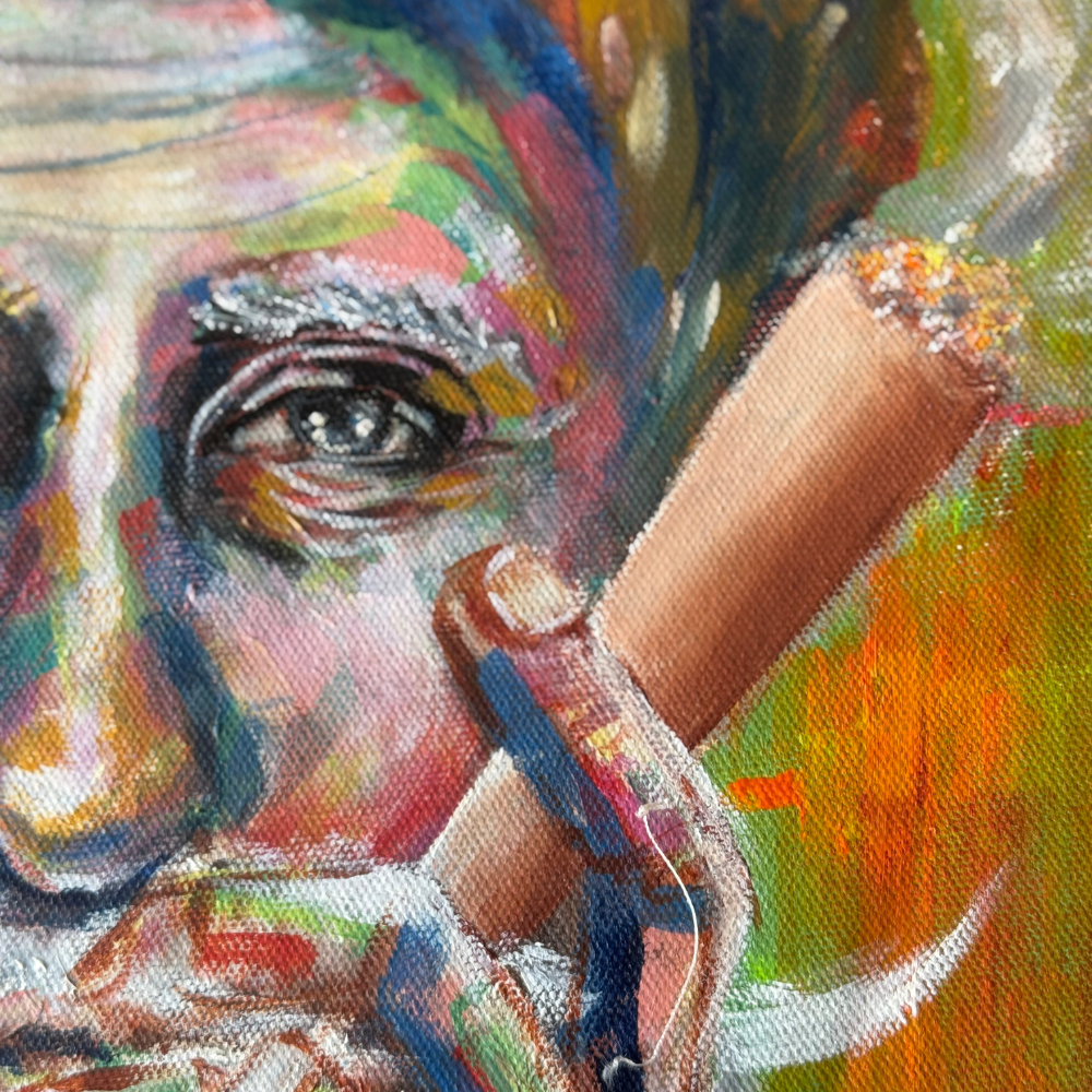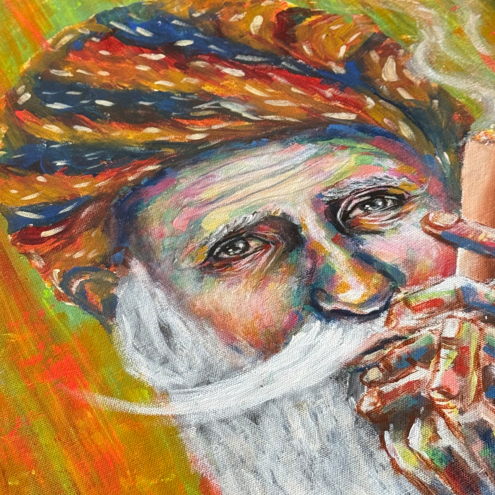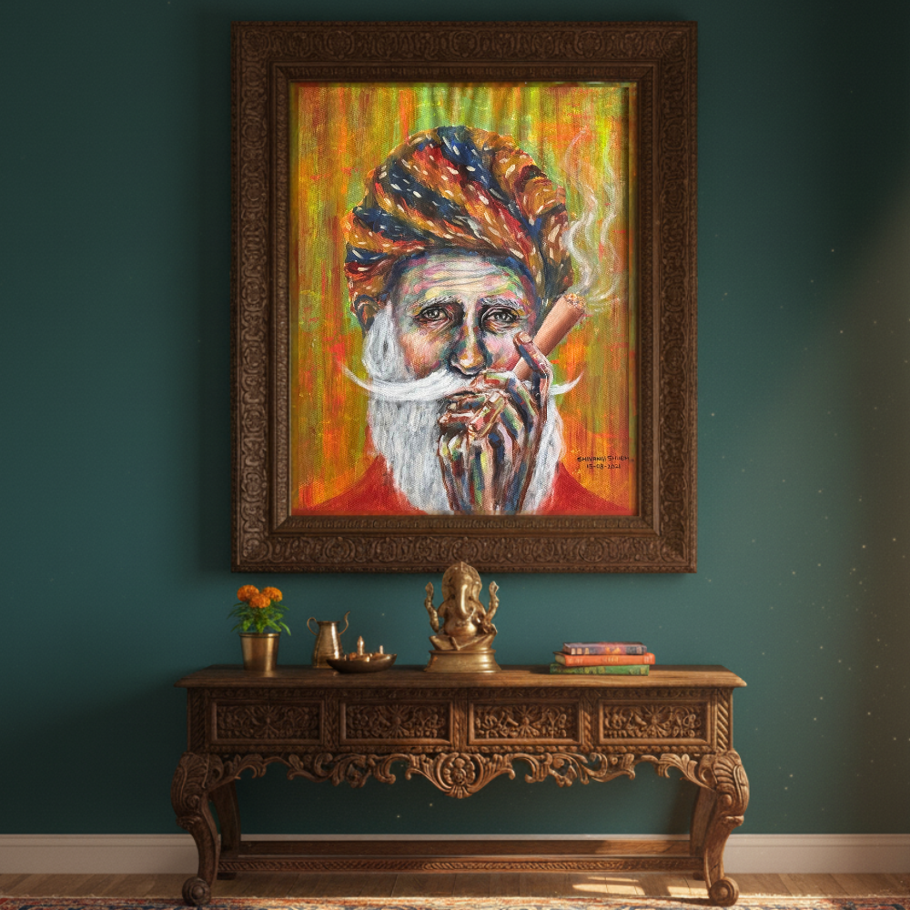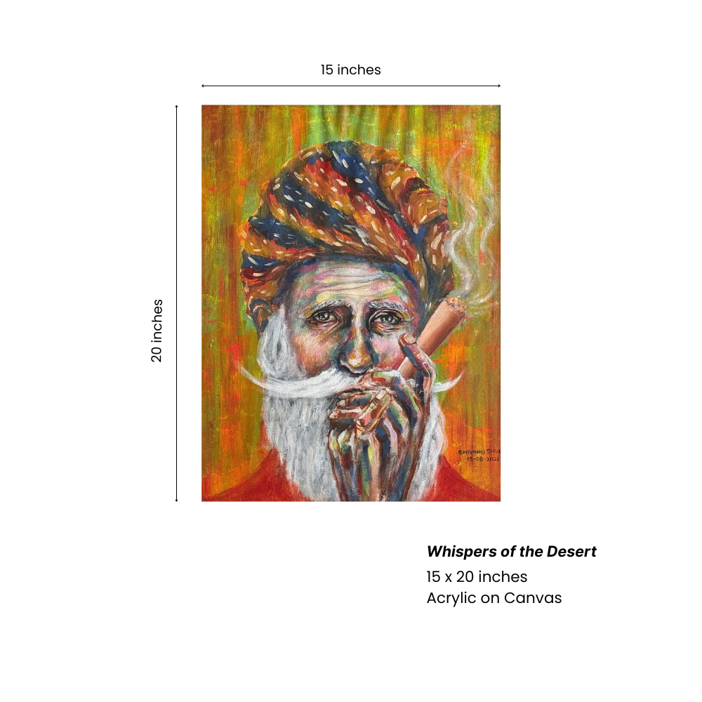 Whispers of the Desert is a vivid portrayal of wisdom, resilience, and timeless tradition. The painting captures an elderly man in a richly colored turban, his expressive eyes carrying the weight of unspoken stories. With a cigar resting between his fingers, framed by a flowing white beard and mustache, he exudes an air of contemplation—caught between memory and silence.