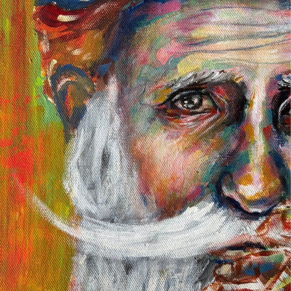 The background is alive with bold strokes of orange, green, and yellow, evoking the warmth and vibrancy of Rajasthan’s landscapes. The layered brushwork and play of colors across his face highlight both age and vitality, making him not just a subject but a storyteller of generations.